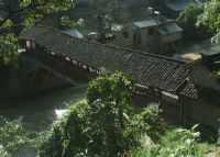 百年的庇護,使得廊橋已經成為三岔河鄉人生活的一部份,溪流在這里且行且和,圍繞木廊橋,岸邊圍起了民房、街道,漸成聚落。橋面的西邊,進入喧嘩的市集。一片依了平緩的山勢逶迤錯落的鄉村建筑搭建起鄉鎮的輪廓,平涂上暗灰的色塊。橋門東邊,一條粗糲的石板路延綿到廣袤的田野,逐漸形成村中的阡陌交通。它連通了東西南北荒野,鄉里人的生活秩序由橋梁規范著,井然之中呈現著鄉土宗法的肅然。
