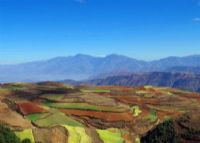 月亮田也叫水坪子,距東川約12公里,是周圍僅有的一片可以種植水稻的梯田,春天可以拍攝到水田灌水后的景象,秋天則是一片金黃。向下眺望,白色房屋散落在田間,仿佛桃源一般。遠處重重山巒,梯田無數,山嶺縱橫交錯,出巒起伏,紅土丘陵一望無際,其中一塊水田看起來仿佛一面玉琵琶,讓人懷疑是否上天遺落于人間的神器。