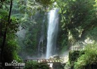 它藏于山巒疊翠,萬木崢嶸,雙峰對峙的方弄山和廣馬山之間,由60米高的懸崖斷碧上傾倒而下,瀑寬約5米,有“疊水入綿,不用弓彈花自散”的景象。除瀑布外,扎雜河流域還由亞熱帶雨林、熱泉、佛腳印、碧溪、怪石、繁花、珍禽共同組成。瀑布下一公里處,有一天然溫泉,泉水清澈見底,熱泉波涌,景象壯觀。在溫泉的一塊巨石上,天然形成的寬約尺許的“仙人腳印”更增添了許多神秘的遐想。似一匹巨幅白綢,遙掛前川,遠離里許,就能聽到它雷鳴般的喉聲,氣勢磅礴、動人心魄,真可謂氣壯山河。若順河而上,來到瀑布前的巨石上觀景,只見懸崖斷壁上雪噴云涌,似白練,似銀綢,似霧雨。崖下深潭,深不可測,潭面浪翻水沸,如鵬擊波驚,驚濤駭浪,如萬斛明珠沉于瓊海,真是“疊水入綿,不用弓彈花自散”的景象,每當陽光燦爛、天高氣爽、煙消霧散的早晨,會有長虹升起。這里已開發為德宏一處新興旅游區,由于河床地勢陡峭谷深,亂石崢嶸,迂回曲折,河水湍急,時而涌起朵朵雪白的浪花,時而又像一群巨獸在巖石間亂竄,形成了不少奇險景觀,真有“九曲十回通幽處”之感。