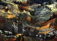 往西遙望,2000多畝阿猛控梯田嵌刻在由南向北從淵谷直伸高山的三座脊梁山,忽高忽低、忽大忽小、忽曲忽直,三座三梁披掛著層層梯田如三條巨龍,盡情揮舞,在夕陽余輝下,紅白黑相映,光彩奪目。往東遠眺,又是2000多畝保山寨梯田全攀附在7座半圓型山梁上,全成彎月型天梯,直指蒼穹。7座半圓型山梁上的梯田又相連,陽光傾瀉,波光粼粼,成立體海洋。7座半圓形山梁中間,又有無數個圓形小山包,每個小山包又被層層圓型梯田繞到頂,山頂部是田棚,青翠竹木果林,似仙境如夢幻。保山寨梯田是元陽梯田中線條好,形體美,立體感強的梯田之一。