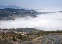 元陽有兩座城,一座是久負盛名的老城新街,一座是新城南沙,老城在山頂,新城在山腳。老城新街坐落在海拔1400余米的高山陡坡上,這里是云的故鄉,每年冬春季節夜晚,云海彌漫在山城與紅河谷之間,與哈尼人民同枕入夢,清晨,朝陽把整座山城與云海染得一片金黃,云海縈繞著山城,慢慢升騰起來,山城在云山霧海間,時隱時現、如夢如幻,宛如仙景。“云霧山城”由此得名。